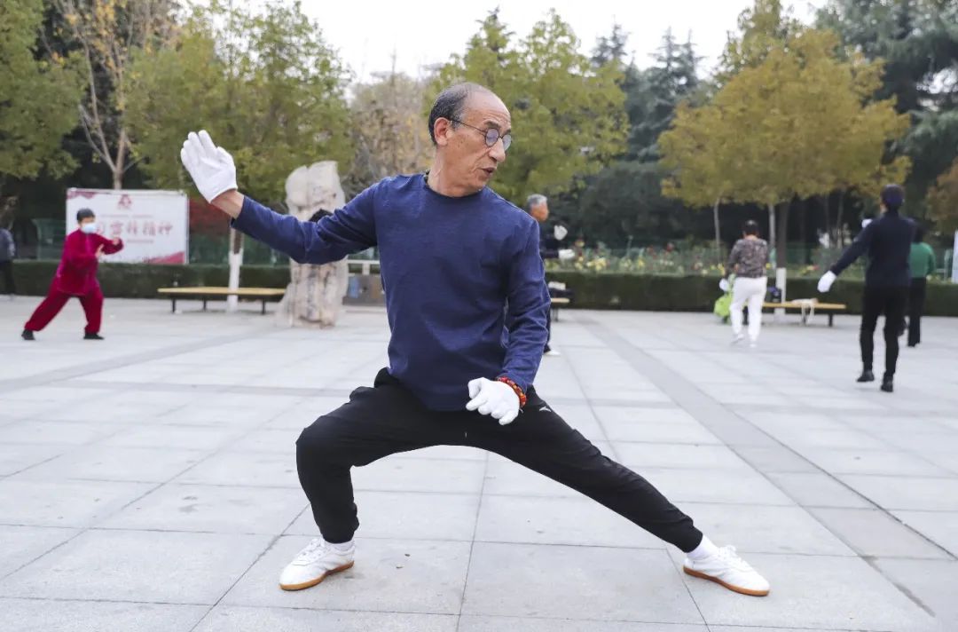 孟庆东,64岁。晨练健身爱好者。常年在公园参加集体太极晨练,多种套路都打得非常熟练。