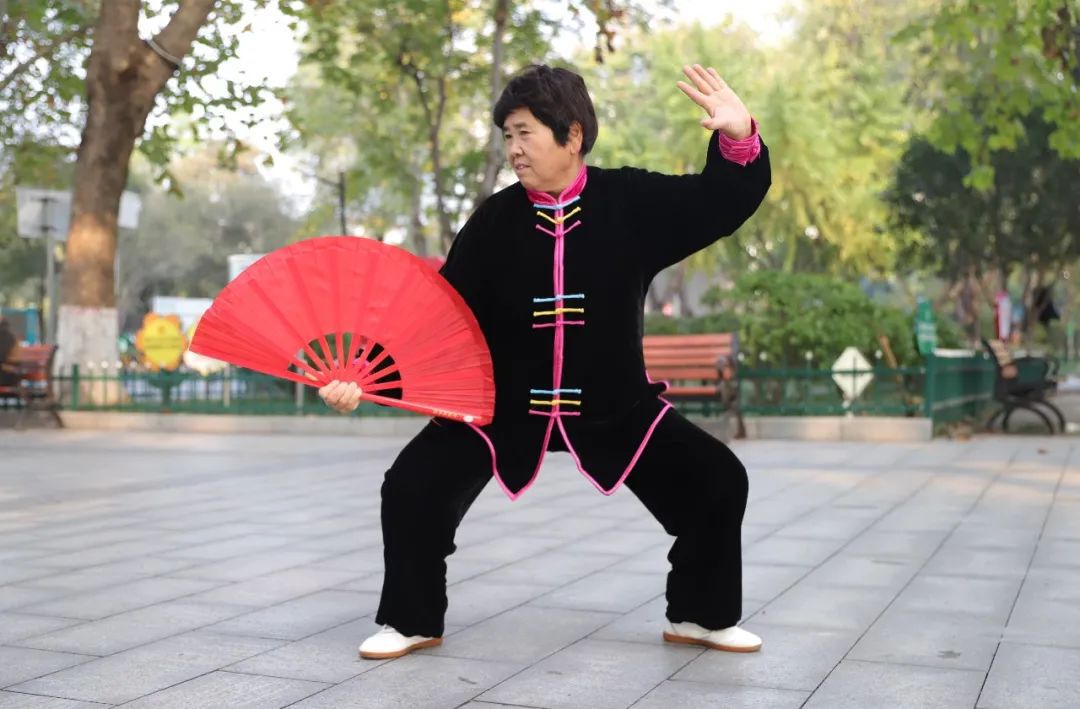 李娴,67岁。习练太极拳、剑、扇20多年,常年在公园或参加集体健身活动或个人独练成为她每天的一项生活内容。