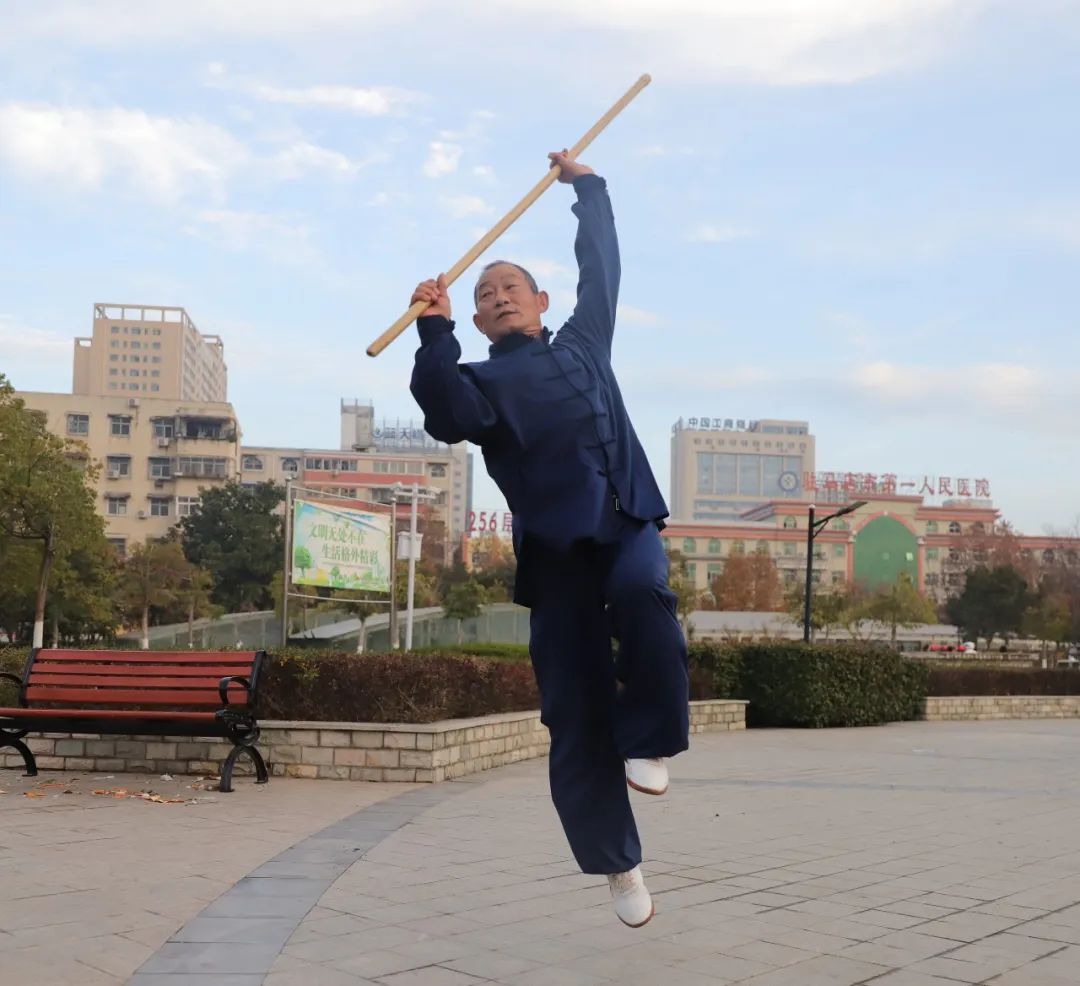 丁效民,68岁。晨练健身爱好者。一套少林镇山棍健身套路习练10多年。拍摄时间:2023年12月9日。拍摄地点:驻马店市靖宇广场。摄影:魏克平